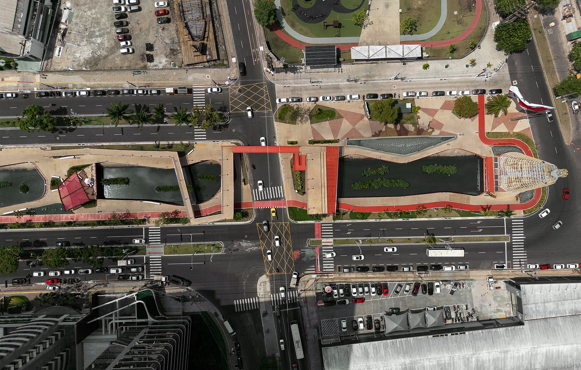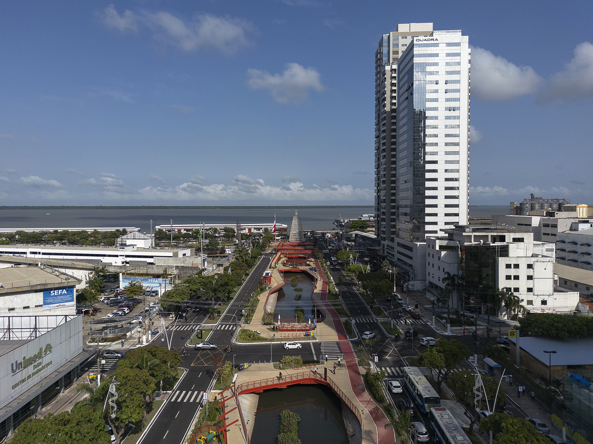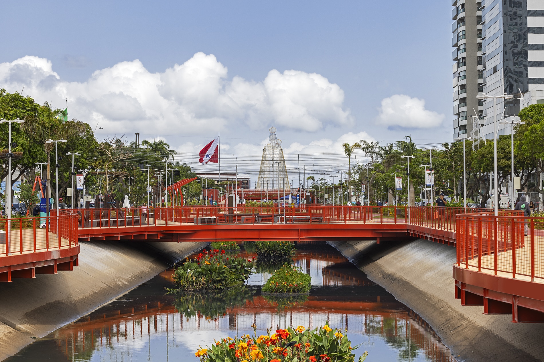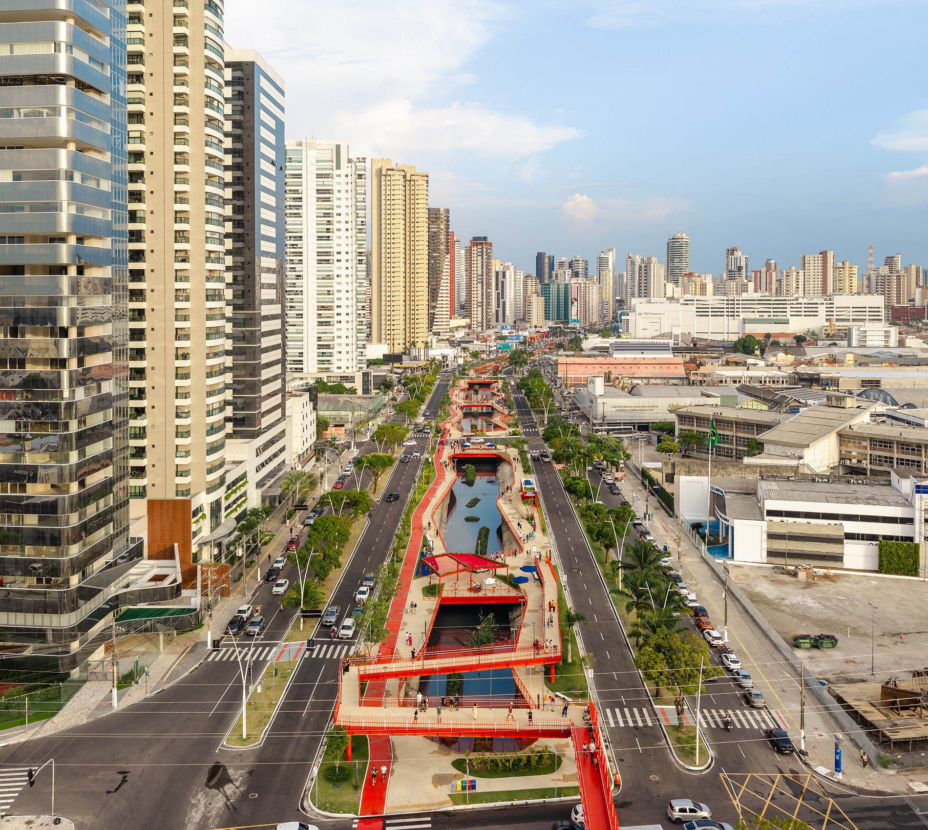La regeneración del Parque Lineal Doca, ubicado en Belém do Pará (Brasil), surge como una intervención urbana estratégica que integra infraestructura, paisaje y memoria para reconectar la ciudad con sus aguas a través de la cualificación de los espacios públicos. Implementado sobre el antiguo Igarapé das Almas —hoy convertido en un canal de aproximadamente 1,2 km de longitud en el camellón central de la Avenida Visconde de Sousa Franco—, el proyecto recupera la identidad hídrica que históricamente estructuró la cuenca del Reduto y que, a lo largo del proceso de urbanización, fue progresivamente enterrada por lógicas fragmentadas y orientadas exclusivamente a la función.