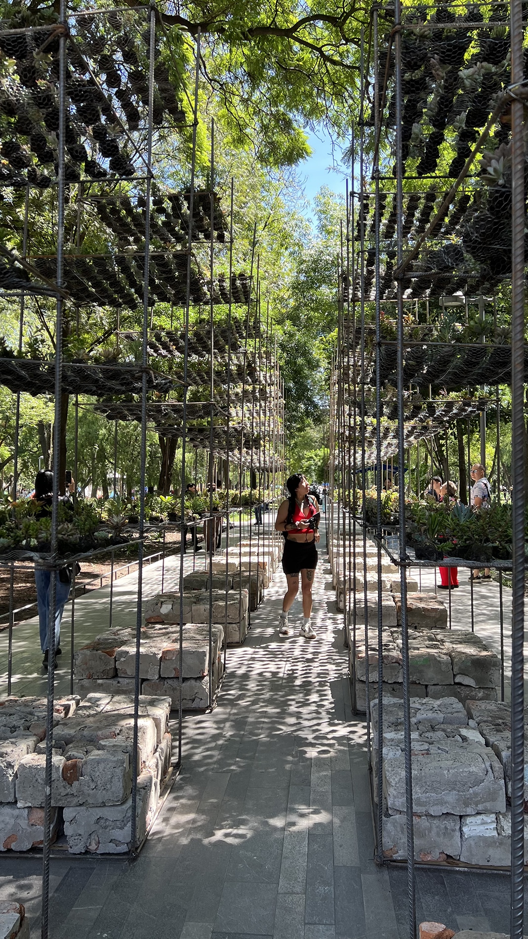 El tercer elemento fue una cubierta ligera formada por planos de malla cernidora que sostenían una retícula de chapines vivos provenientes de Xochimilco. Distribuidos a lo largo del pabellón como una ofrenda vegetal, estos chapines estuvieron disponibles para ser adoptados por los visitantes prolongando así el gesto social y ecológico de la instalación.