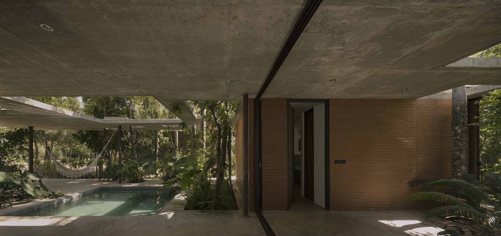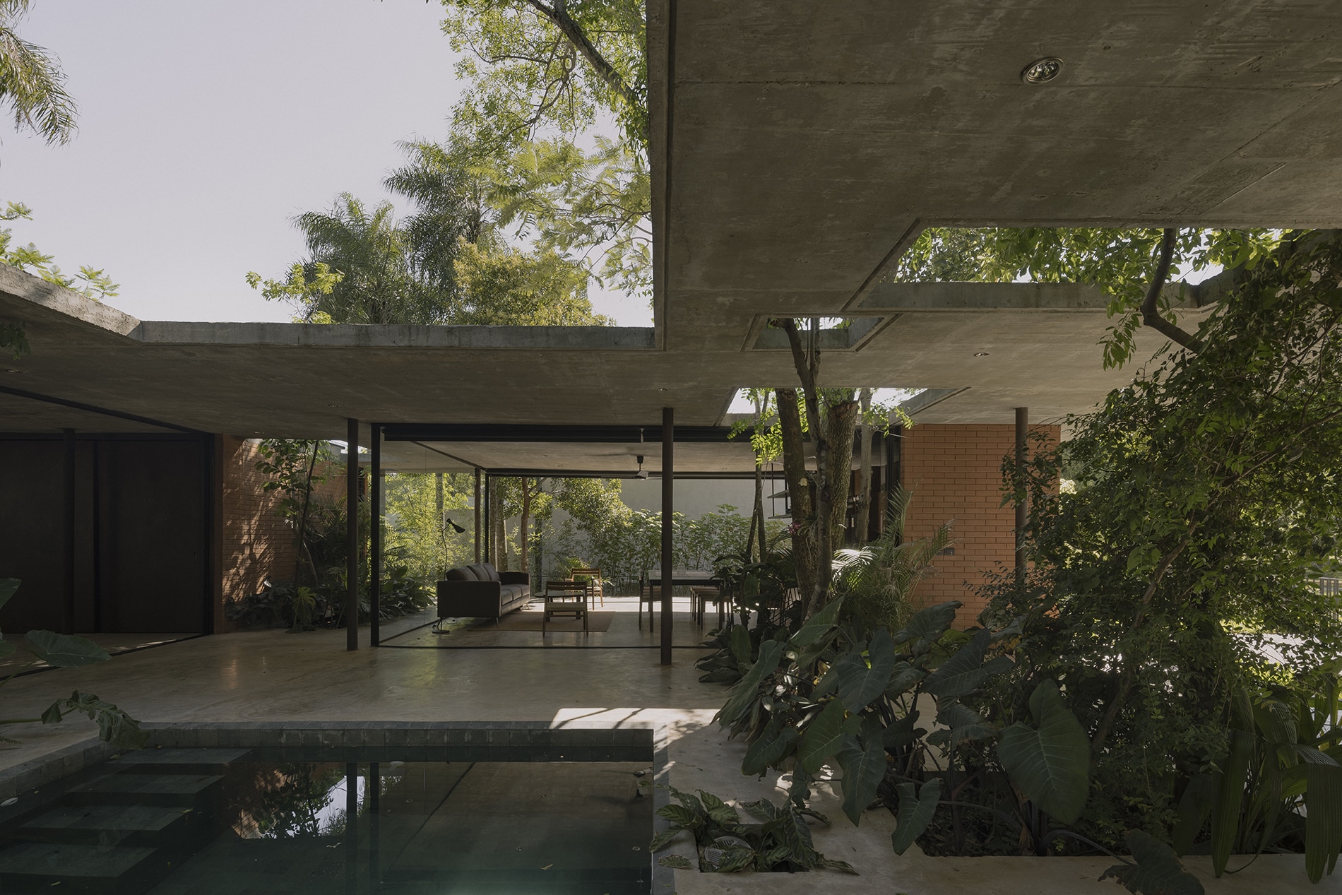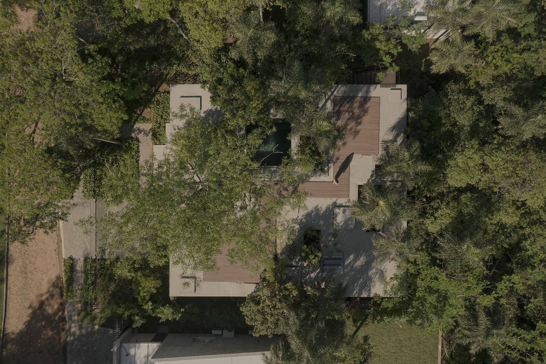 Los árboles delinean la relación entre los espacios ocupados y los vacíos, liberando a la estructura de los sistemas de grilla convencionales y estableciendo un ritmo dinámico que refleja los patrones de la naturaleza. Esta disposición no ortogonal de los pilares contribuye a la estabilidad lateral de la estructura. Los volúmenes sólidos se construyen utilizando bloques de tierra comprimida (BTC), lo que refuerza el compromiso del proyecto con un diálogo material con el paisaje.