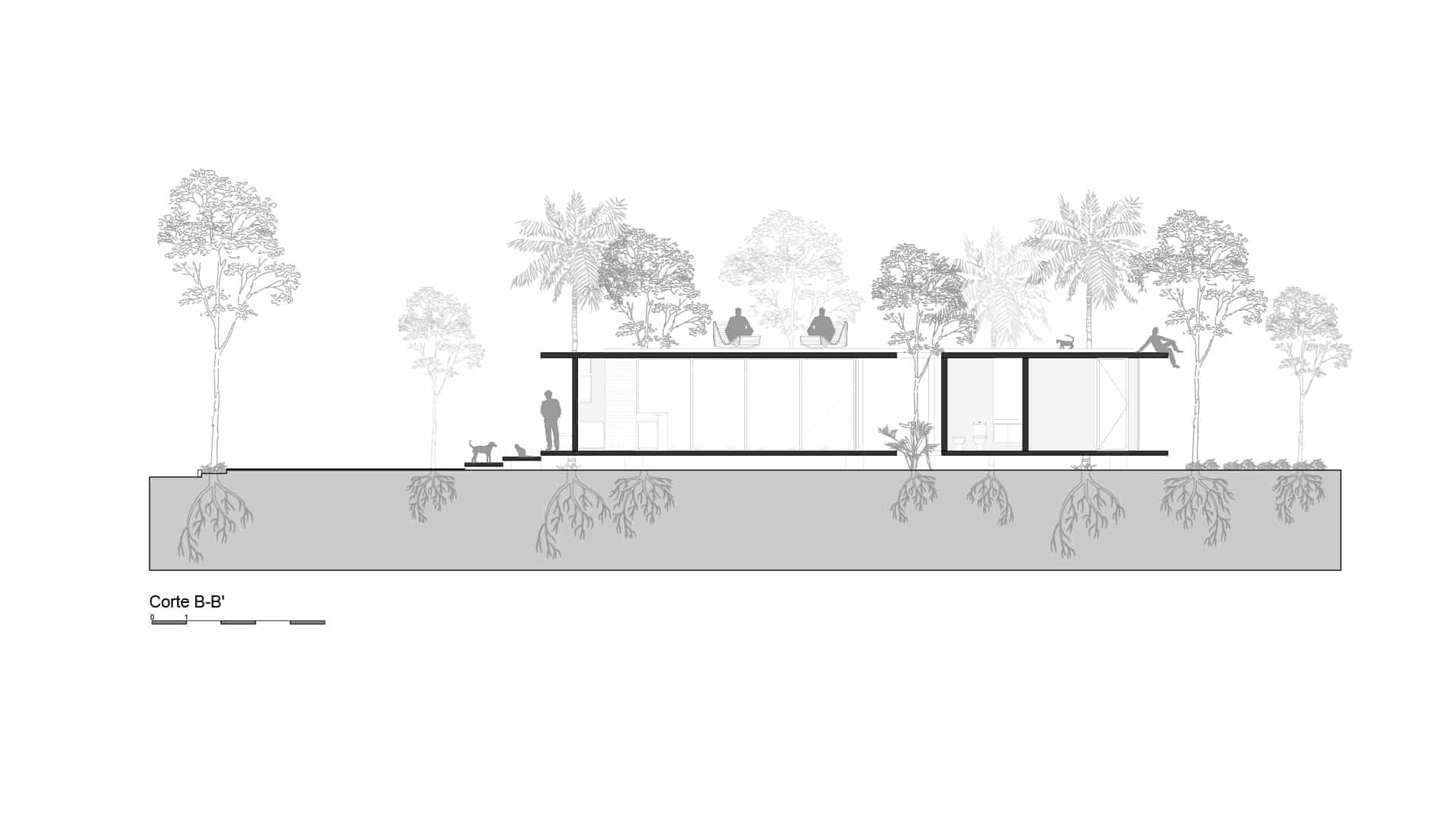 La composición espacial se desarrolla a través de dos planos horizontales diferenciados. El plano principal, el suelo, se eleva sutilmente, permitiendo que las raíces de los árboles evolucionen libremente con el tiempo. En paralelo, el plano secundario, el techo, replica esta geometría para conformar una terraza que invita a los ocupantes a disfrutar de vistas panorámicas de las copas.