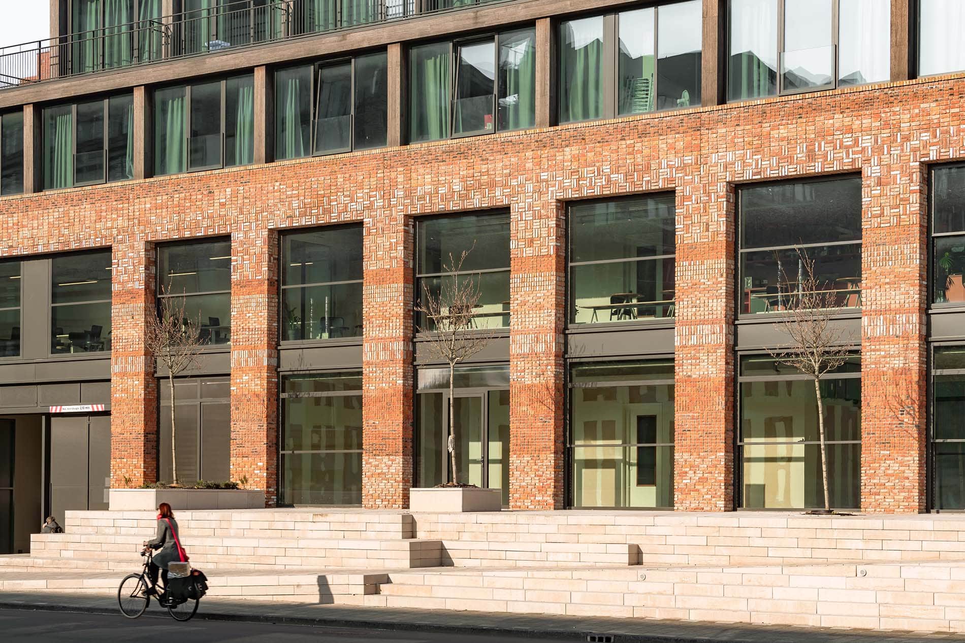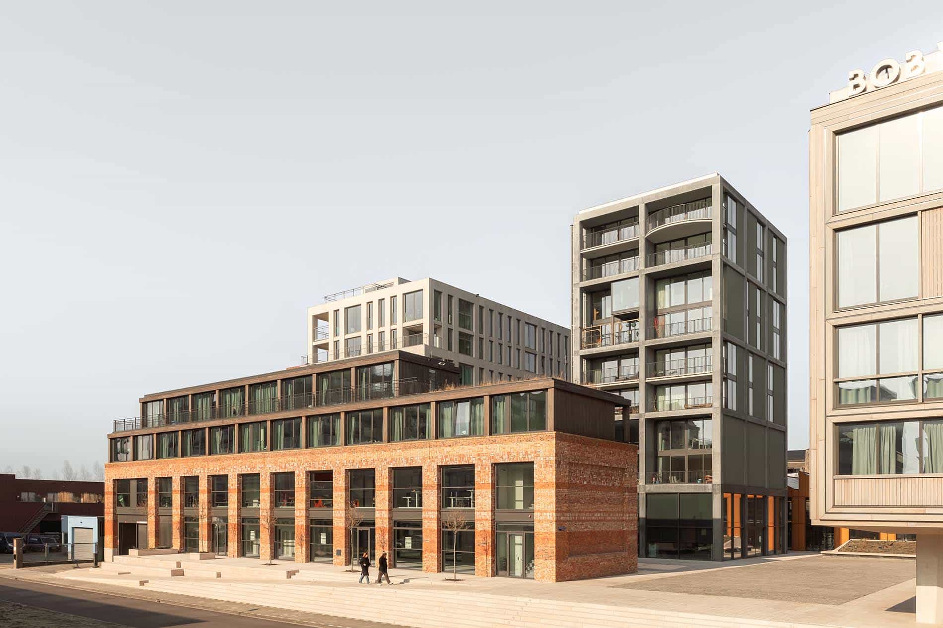 La arquitectura tipo loft, con grandes ventanas, techos altos, amplios claros estructurales y materiales robustos, remite al lenguaje industrial de los puertos de Ámsterdam, mientras que la plaza de piedra natural y las grandes escaleras aportan un carácter alegre, casi del sur de Europa. El edificio del restaurante cuenta con una fachada monumental de ladrillo y se retranquea ligeramente de la línea de edificación; el espacio resultante, orientado al sur, se equipa con amplios escalones para sentarse: las “escaleras españolas” de Buiksloterham.