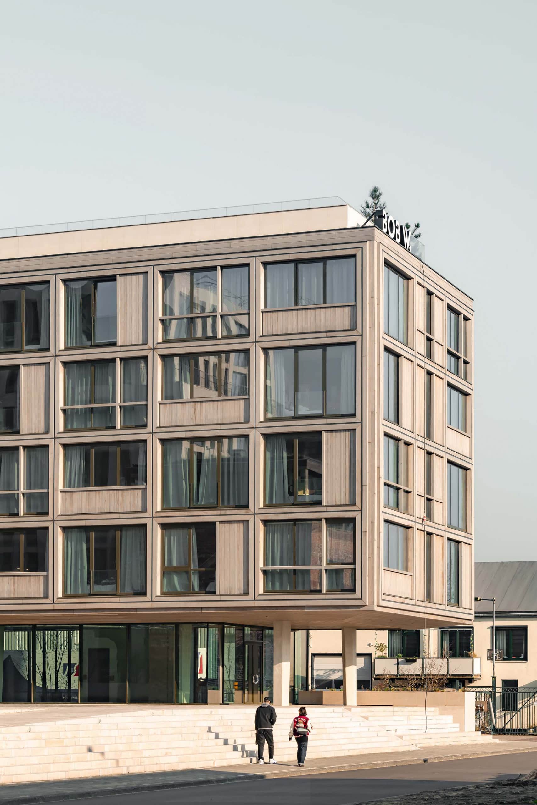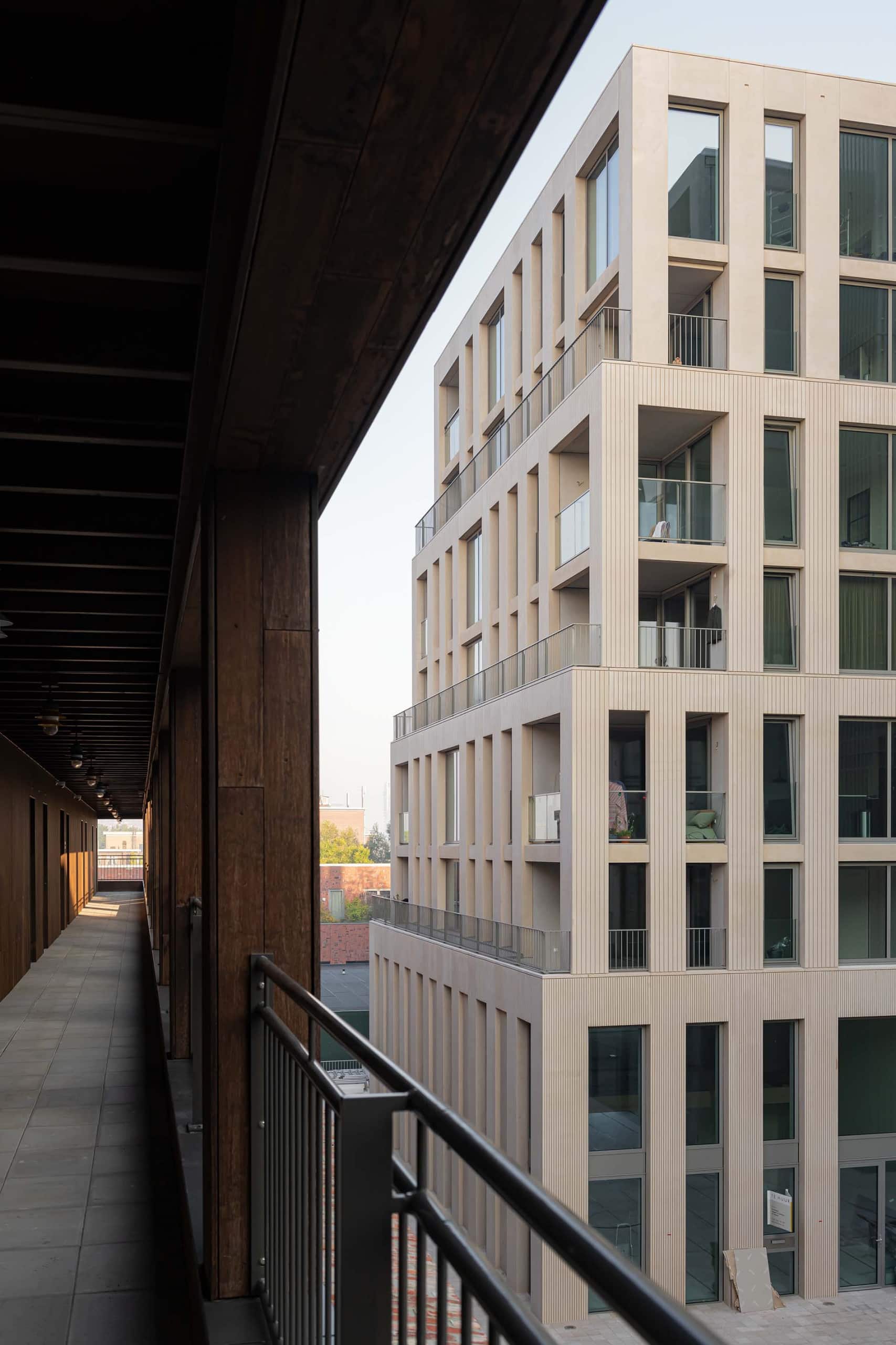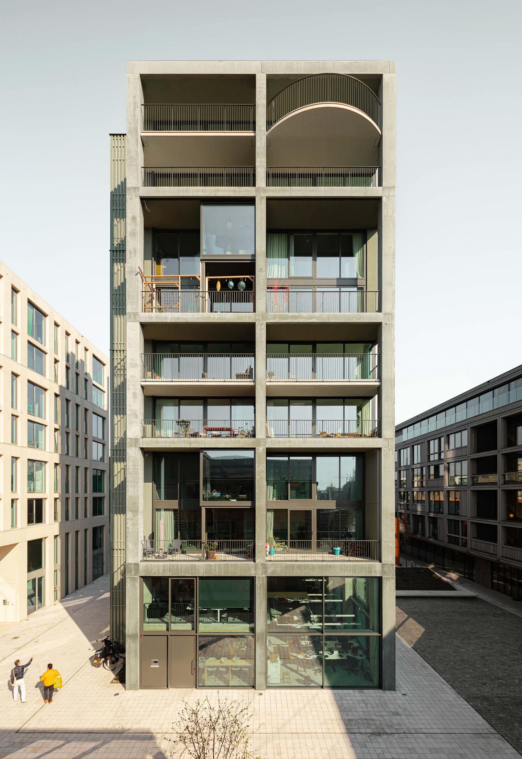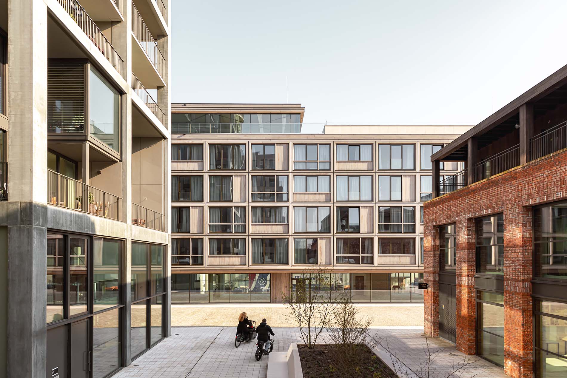 La torre de concreto verde suave, con núcleos y envolventes adaptables para los Superlofts, permite a los residentes personalizar radicalmente sus interiores. Marca la “plaza central del pueblo”, pavimentada con piedra natural desmontable. El bloque residencial blanco está construido con concreto atemporal, especialmente perfilado y parcialmente reciclado. El edificio del apartahotel cuenta con una fachada de madera proveniente de fuentes renovables. El edificio de oficinas tipo almacén está hecho de acero corten reciclable y duradero y, gracias a su gran altura libre, también es apto para usos productivos. La fachada de ladrillo del café y espacio de coworking se realizó con ladrillos reciclados, manipulados en su textura superficial y colocados en distintos aparejos.