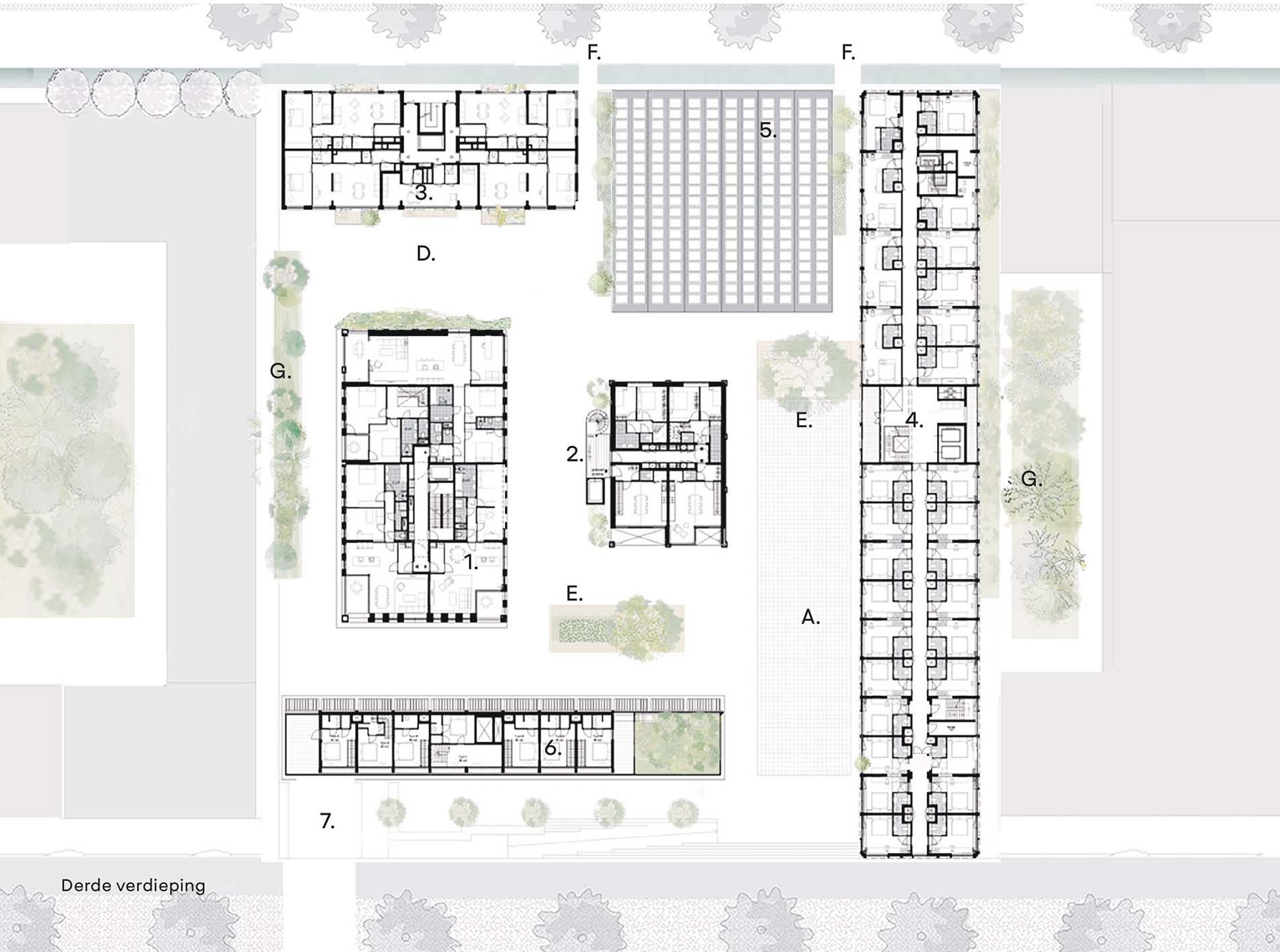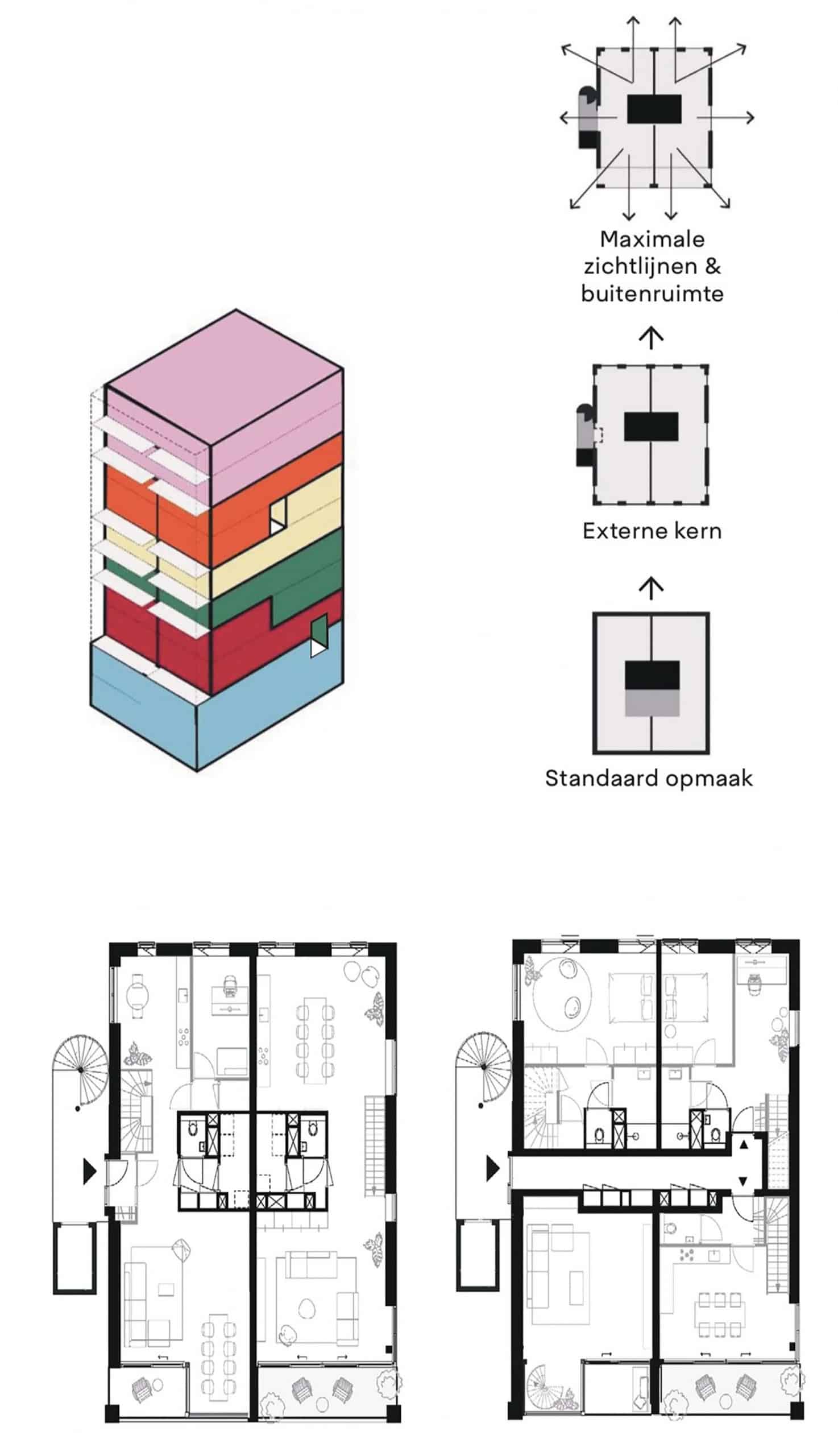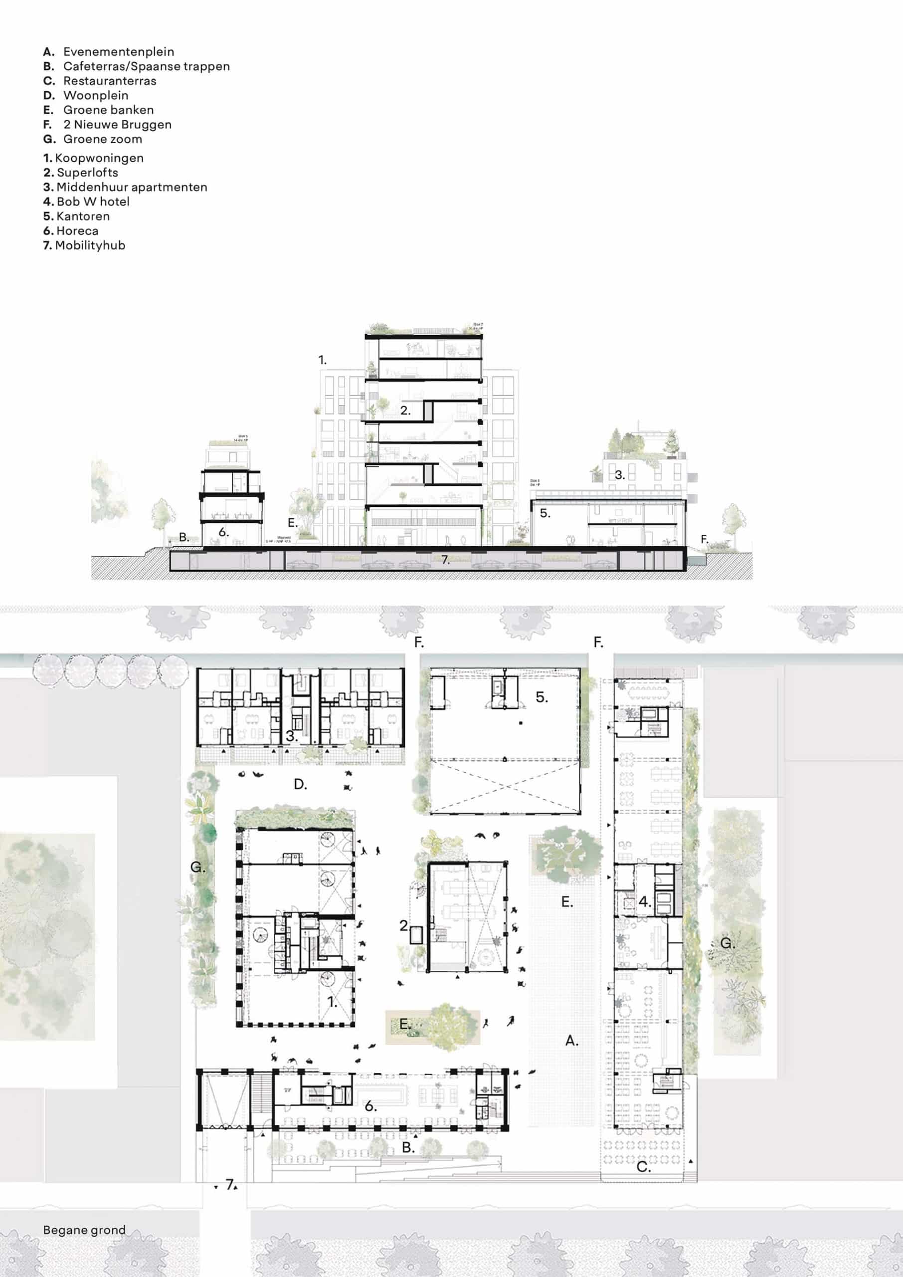 Se abrió el antiguo predio industrial cerrado de 80 x 80 metros hacia su entorno y lo reorganizamos cuidadosamente en un conjunto de seis edificios, plazas y callejones, conectados con el barrio mediante dos puentes y una escalera monumental. El conjunto incluye una mezcla dinámica de funciones: departamentos (en renta y venta, de entre 60 y 130 m²), incluida una torre con diez Superlofts; espacios comerciales y de oficinas; dos cafés-restaurantes; y un apartahotel para estancias medias y largas. En la azotea habrá un club de sauna con alberca y vistas al lago IJ.