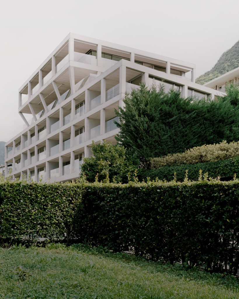 La estructura se inclina hacia fuera para soportar un elemento saliente en la parte superior con el ático, cambiando la percepción del marco y el paisaje más allá. Materialmente, el edificio suaviza su aspecto monolítico con paneles de hormigón martillado como relleno de la estructura.