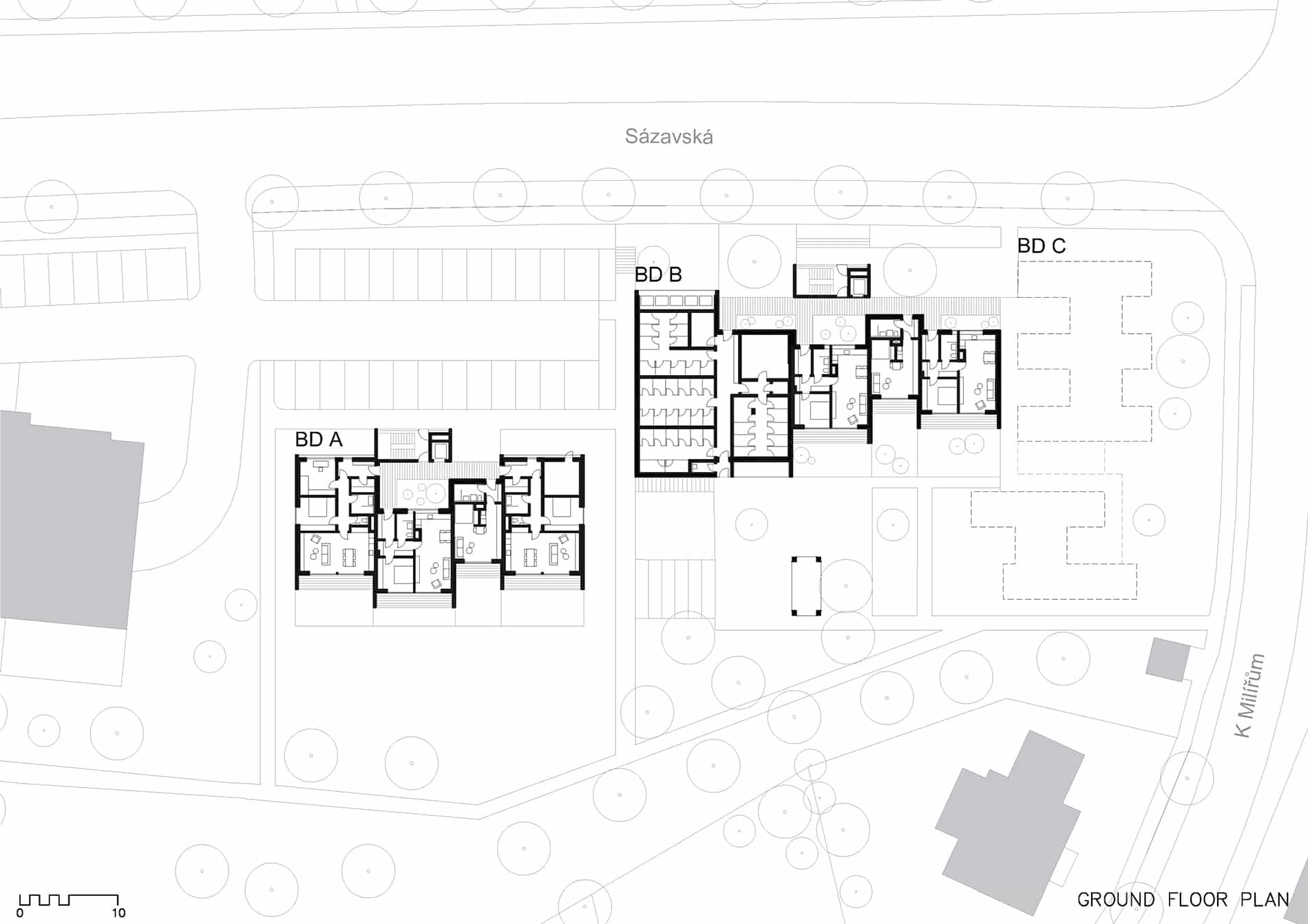 El conjunto se ubica en el área de Klafar, al noroeste de la ciudad de Žďár nad Sázavou. Su disposición urbana retoma el principio de la manzana tradicional, estableciendo una secuencia de espacios que transita de la calle pública a patios semiprivados y jardines de acceso. La organización del conjunto genera un patio orientado al sur, mientras que las áreas de recreación y vegetación se localizan en el sector occidental del terreno.