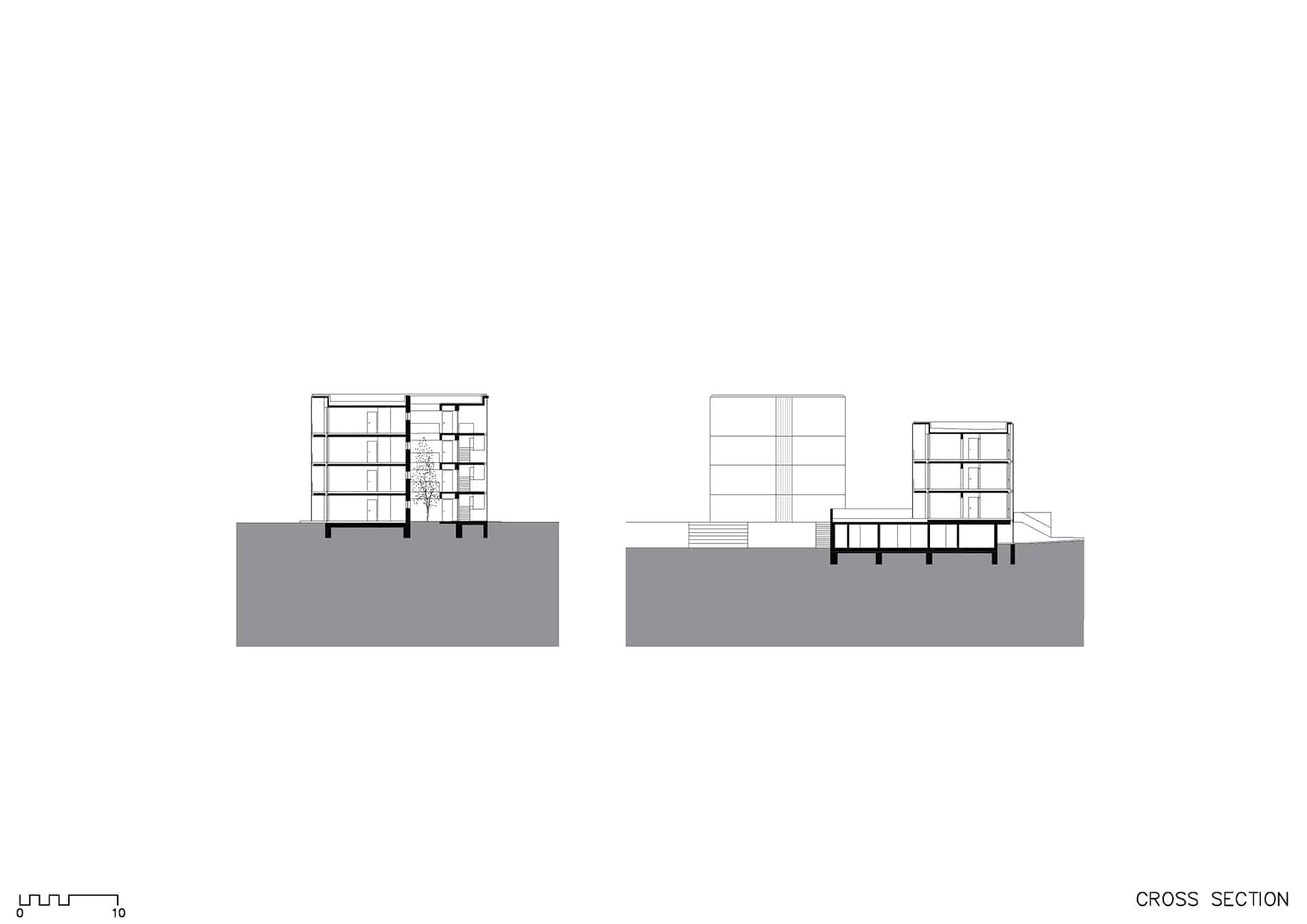 Los edificios se conciben como una serie de módulos verticales de cuatro niveles. Cada uno está definido por muros portantes transversales entre los cuales se insertan pórticos retranqueados con contraventanas de madera, produciendo un juego de profundidad y superposición de planos. Estos pórticos se orientan hacia el patio interior. Hacia la calle Sázavská —con orientación norte— se disponen galerías de acceso de madera y núcleos de circulación de concreto armado con escaleras y elevadores. Estas fachadas se presentan más cerradas, con ventanas horizontales corridas. Los volúmenes residenciales se desplazan hacia el patio respecto a las galerías, generando atrios verticales de distintas profundidades donde se incorpora vegetación. La mayoría de las viviendas se orienta al suroeste, tanto en las áreas de estancia como en los dormitorios.