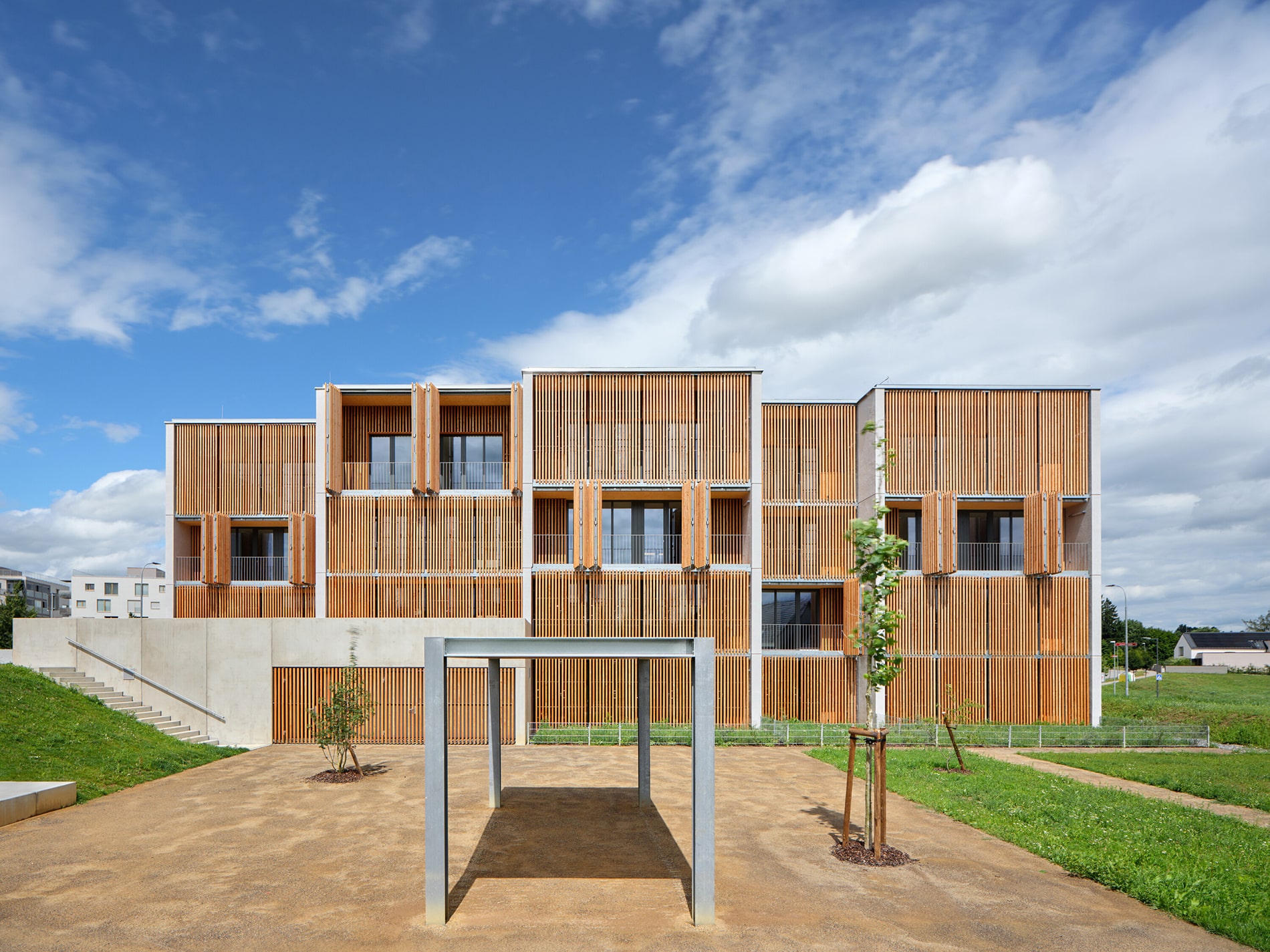La estrategia de sostenibilidad se apoya en una volumetría compacta y en un sistema constructivo modular que combina madera y concreto. El conjunto incorpora soluciones pasivas como contraventanas para control solar y ventilación cruzada natural en los departamentos. La vegetación se integra tanto en cubiertas como en los atrios, contribuyendo a mejorar las condiciones ambientales interiores y exteriores, además de favorecer la infiltración del agua mediante superficies permeables.