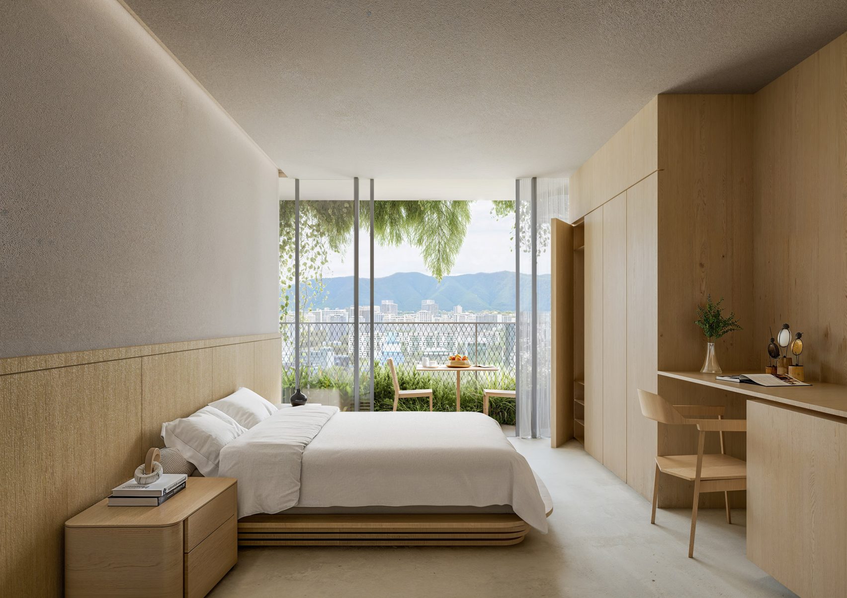 La propuesta formal se inspira en la geografía andina, que se manifiesta en una envolvente texturizada donde balcones retranqueados y superficies estriadas generan una fachada porosa. Esta estrategia busca integrar vegetación en distintos niveles y reforzar la relación entre interior y exterior mediante aperturas de piso a techo. Según el propio Kuma, el proyecto retoma afinidades entre la tradición material japonesa y ecuatoriana, particularmente en su énfasis en la cerámica, las texturas naturales y la incorporación de la naturaleza como componente arquitectónico.
