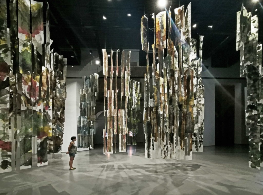 Las acuarelas que se disponen sobre estas lamas de papel forman series. Las series se organizan en función del color, mucho color, y de los gestos. El blanco del papel también juega. Te has de sumergir en los papeles, que suben como cuatro metros sobre tu cabeza y bajan hasta tu rodilla. Has de jugar con las sombras de los focos. Has de crear recorridos. Como un bosque, cada árbol de papel es igual que el otro y diferente a la vez. Como un bosque es sensible a quien lo visita, a los corrientes de aire. Al sonido. La obra es un concierto para la vista. La expresión de una lucha. Un camino para el visitante.