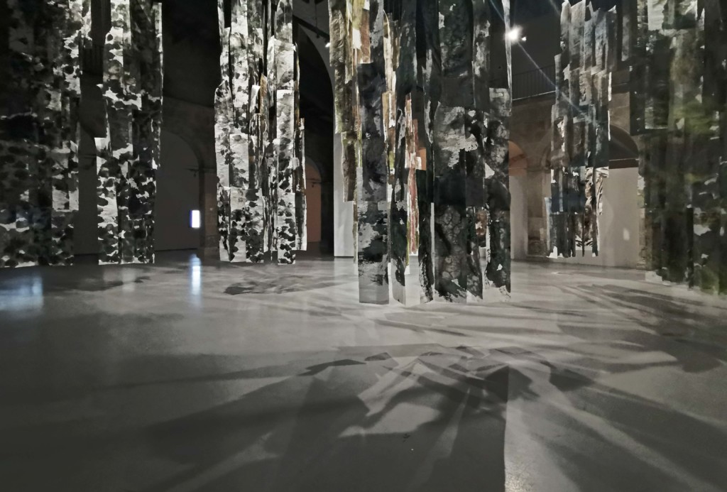 Esta obra propone esto exactamente. Pocas exposiciones se habrán hecho en el Santa Mònica que ocupen semejante volumen con tan poca cantidad de materia. La suma total de los papeles y de los hilos de pescar que los sujetan no creo que llegue a los 10 kilos. Su volumen ocupa literalmente todo el espacio central de exposición de la institución, el corazón de lo que era el claustro del convento donde se ubica el Santa Mònica, hecho nada menor para los RCR. La obra consiste en láminas de papel de aproximadamente treinta centímetros de ancho por metro y medio de alto, láminas colgadas del techo superpuestas las unas sobre las otras en grupos verticales que dan la idea de un árbol sin ninguna literalidad en su ejecución. El papel es un papel oriental especial, un papel fibroso de cedro de una consistencia textil. Está acuarelado, pintado con enormes pinceles que pueden tener tranquilamente cinco o seis centímetros de diámetro, pinceles capaces de absorber medio vaso de agua de una sola pincelada. Cuando la pintura se seca el papel se retrae, se arruga y, sin perder esta consistencia textil, semeja una corteza. La aguada da textura, da materia pero no se impone al papel. No hace como la pintura al óleo, que cuando se distribuye uniformemente sobre la tela la anula. La aguada sobre papel se puede disponer en capas muy gruesas sin que el papel pierda su presencia. Es papel, es color, es textura. Y la relación con nuestro cuerpo. Las primeras acuarelas de RCR están hechas sobre papeles pequeños. Los primeros gestos son caligráficos. Después se empieza a mover la muñeca. Luego el brazo. Estas acuarelas están pintadas con todo el cuerpo. La propia acción de acuarelar el papel es una danza. Un campo de batalla.