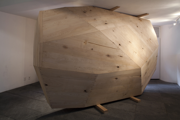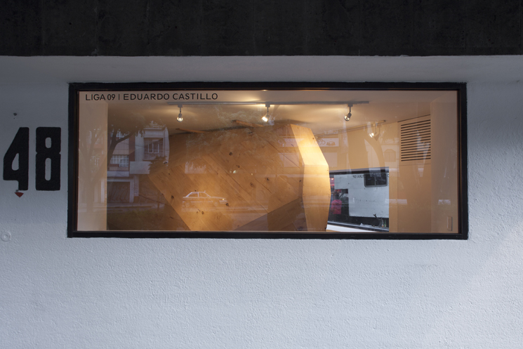 Invocar sonidos o silencios es común en el arte contemporáneo. En su libro Silencios Elocuentes, Carlos Martí Arís afirma que “sólo en contadas ocasiones el silencio pasa a ser el territorio germinal del arte, como manantial oculto del cual pueden brotar, las aguas del sentido”. El libro nos acerca al trabajo de cinco artistas que han hecho del silencio el ingrediente sustancial de su obra, al rechazar el arte como histérica agresión a los sentidos y reafirmar el arte como contemplación. Desde esa misma perspectiva de rechazo y afirmación Eduardo Castillo nos invita a escuchar –a leer y tocar– “Sonidos Opacos”, a través de una pieza robusta de madera que ocupa, explora e invade el pequeño gran espacio conformado por LIGA. “Propongo ocupar una sala en opacidad, a medio camino entre guarida y remanso para las hordas”; una pieza silenciosa que entra en dialogo con el espacio y lo cuestiona, una estructura de madera de 2.26 metros de alto que entiende que la sala ya contiene un lugar íntimo y permeable y que delega a la densidad de la masa, la desmesura que alcanza como esencia.