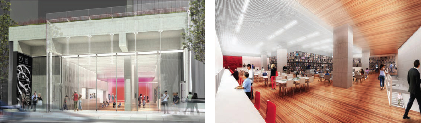 Al interior, las tres plantas están abiertamente conectadas para permitir la entrada de luz y las vistas, proveyendo un sin fin de nuevas oportunidades al disfrute y la interacción social: “desde conciertos jazz, festivales de música o diferentes proyecciones de cine”. Programas que se irán develando poco a poco con el uso del espacio. La adaptable planta abierta y su integración con los libros, el arte y la tecnología permiten al usuario disfrutar de un paisaje accesible e intuitivo que ofrece un amplio espectro de espacios públicos y privados, reconociendo así que la única manera posible de construir comunidad es gracias al empoderamiento individual del usuario desde el que descubrir su propio nicho creativo.