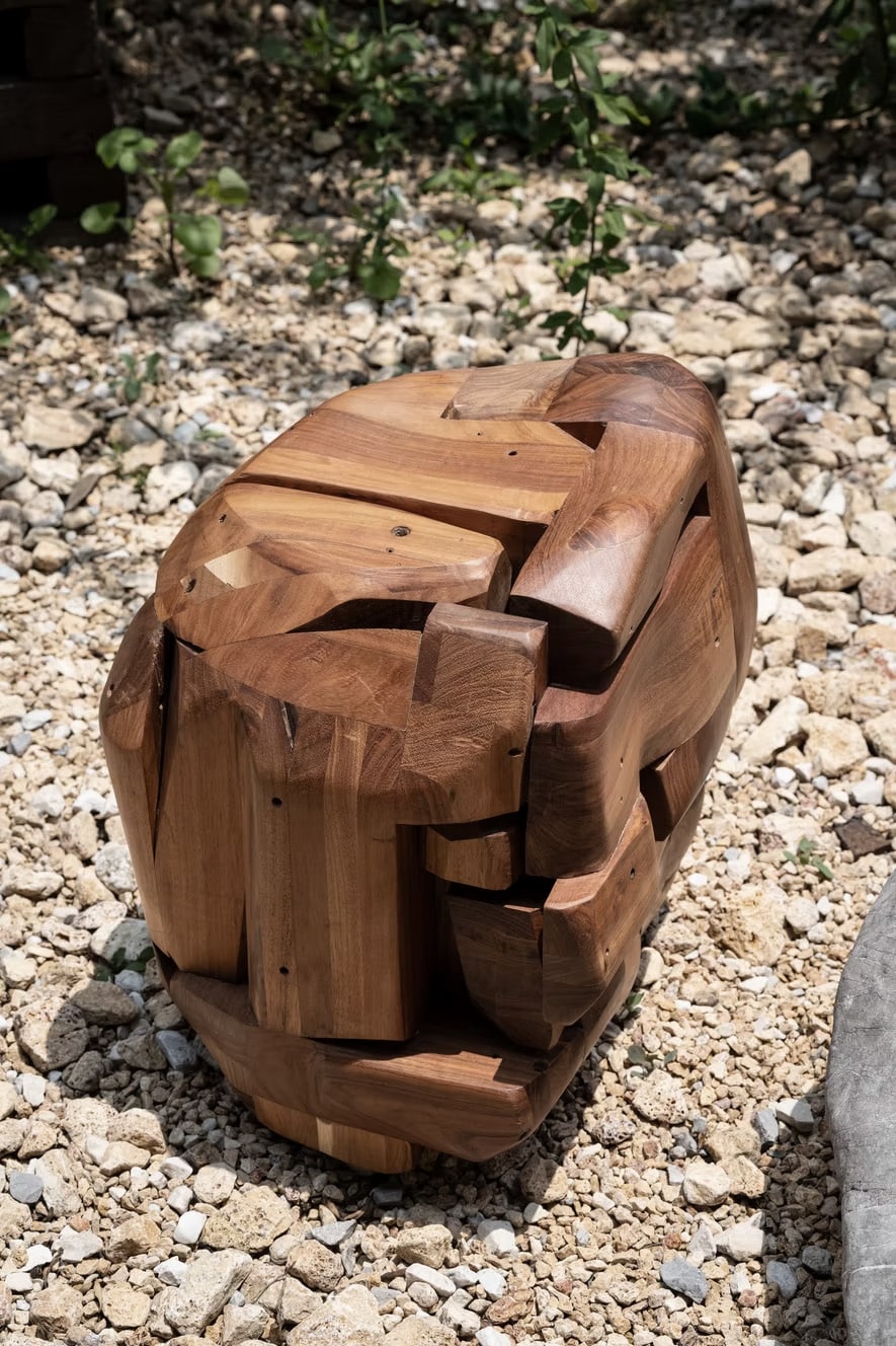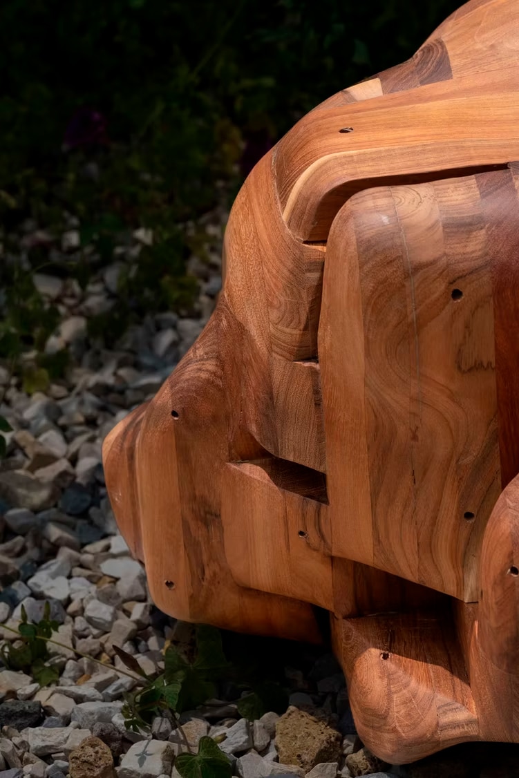El primer movimiento fue el más íntimo. Rocas es un conjunto de objetos de madera recuperada de un proyecto anterior, fragmentos que el estudio guardó sin saber aún qué querían ser. A través de la maquetación, la experimentación y el juego, el equipo de diseño entró en un diálogo con el material mismo. No había plano preconcebido ni idea previa que acatar. Cada veta indicaba un camino posible; cada corte, una curva a seguir. El objeto no se adapta al usuario; le pide que se adapte a él. No es un asiento ergonómico. Es una declaración de principios: entender lo que se tiene, dejarse llevar por los deseos del material, y producir el mejor resultado posible sin vanidad ni preconcepción. Zagorin describió este proceso con una poesía contenida: el equipo simplemente se dejó llevar. En cada pieza de madera había una vocación latente, y la labor fue escucharla.